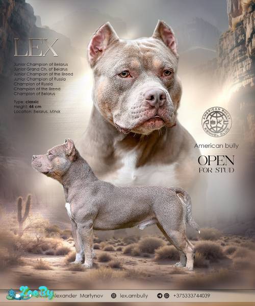 Предлагается для вязки кобель породы Американский Булли Основная информация: Тип: Классик Рост в холке: 44 см Окрас: Лиловый триколор Прикус: Ножницы Хвост: Полный, без заломов Документы: ABKC Экстерьер: Кобель с отличной породной анатомией — мощный костяк, широкая грудь, объемная голова с выраженной породной мускулатурой. Отличный темперамент и сбалансированный характер. Титулы - Junior Champion Belarus - Junior Champion Breed - Junior Grand Champion Belarus - Junior Champion Russia - Champion Belarus - Champion Breed Belarus - Champion Russia Продолжает активную выставочную карьеру! ? Условия вязки: Обсуждаются индивидуально. Все вопросы — в личные сообщения. ?Находимся в Минске (РБ), есть возможность приехать к вам