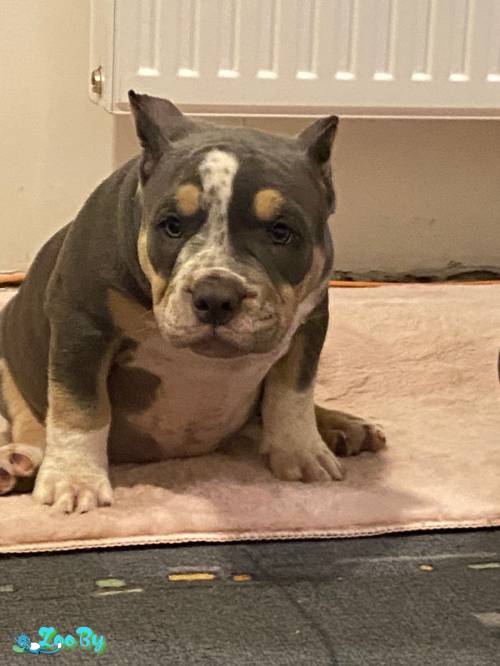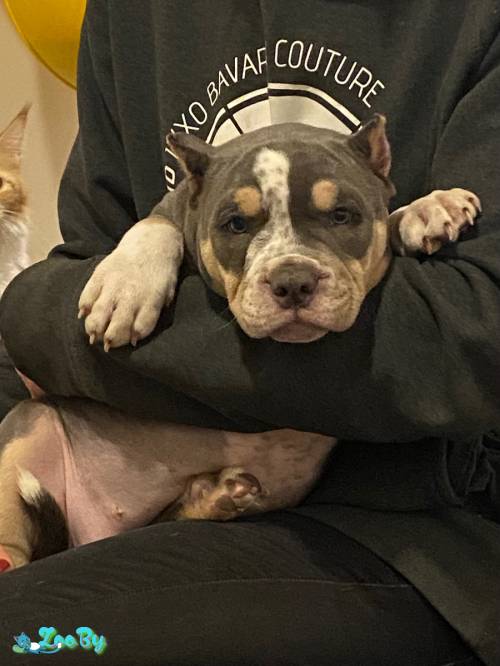 Очень красивая и яркая девочка булли в окрасе голубой триколор, приучена к пеленке,знает улицу,дружит с котиками и другими собаками. Родители проверены на породные заболевания. Полный пакет документов.